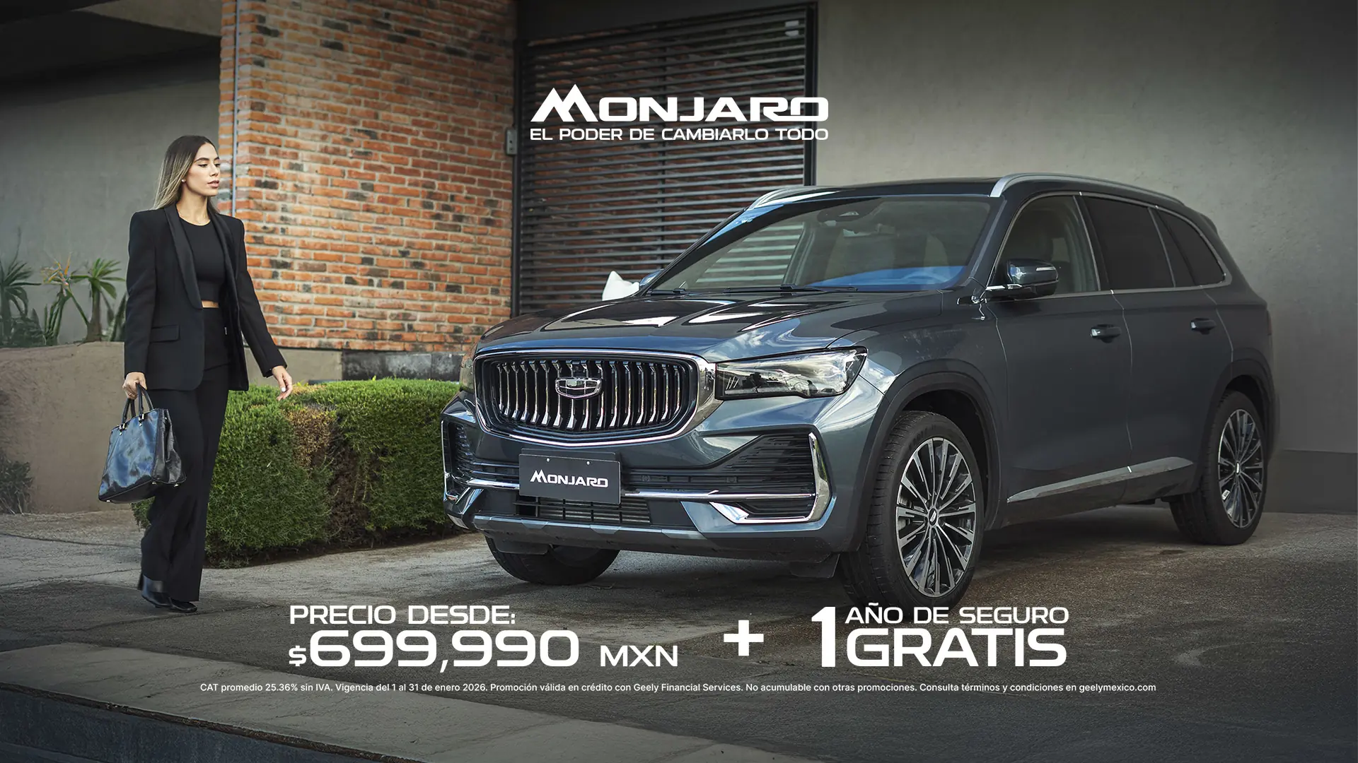 El año de seguro gratis aplica únicamente para el modelo Monjaro 2026 en su versión GF, en operaciones de crédito a través de Geely Financial Services (BBVA). Válido solo con aseguradoras participantes. Consulta especificaciones y condiciones con tu Distribuidor autorizado Geely. Al finalizar el periodo del seguro gratis, el cliente deberá contratar un seguro conforme a lo señalado en su contrato de crédito.