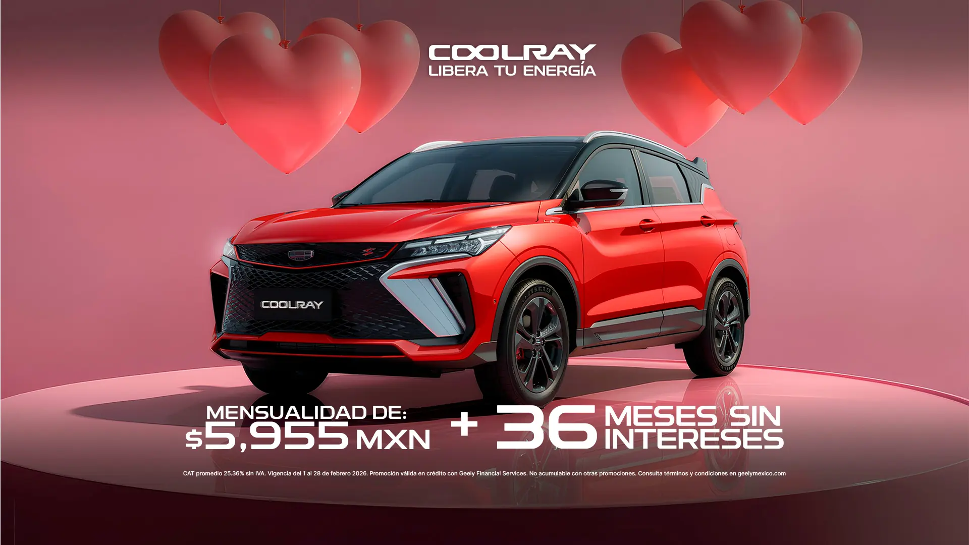 Imágenes de referencia. Esta oferta es válida en toda la República Mexicana, durante el periodo comprendido del 01 de febrero al 28 de febrero de 2026 o hasta agotar existencias. No aplica con otras promociones ni en la compra de flotillas. Para conocer planes y modalidades de crédito, verificar precios, requisitos de contratación, comisiones, disponibilidad, términos y condiciones consulta a tu Distribuidor Autorizado Geely®.