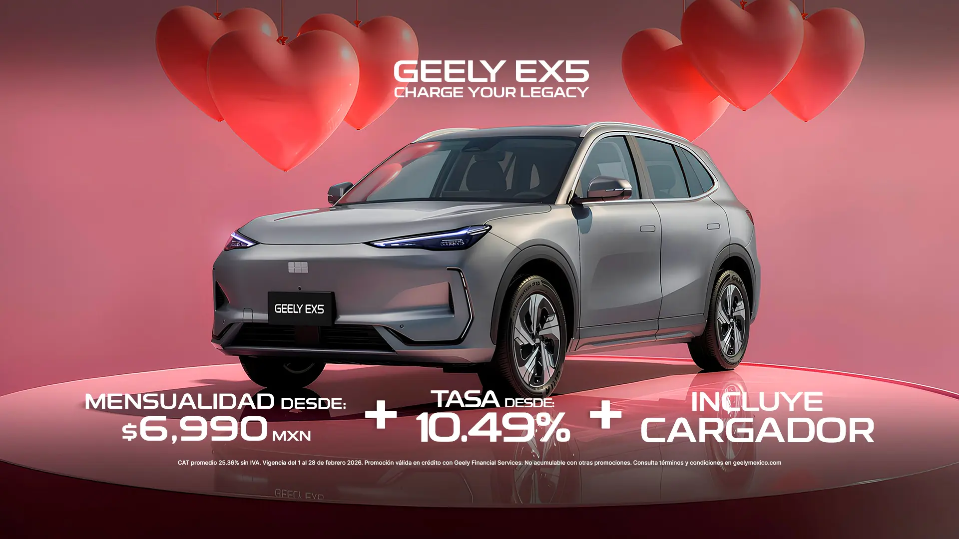 Imágenes de referencia. Esta oferta es válida en toda la República Mexicana, durante el periodo comprendido del 01 de febrero al 28 de febrero de 2026 o hasta agotar existencias. No aplica con otras promociones ni en la compra de flotillas. Para conocer planes y modalidades de crédito, verificar precios, requisitos de contratación, comisiones, disponibilidad, términos y condiciones consulta a tu Distribuidor Autorizado Geely®.