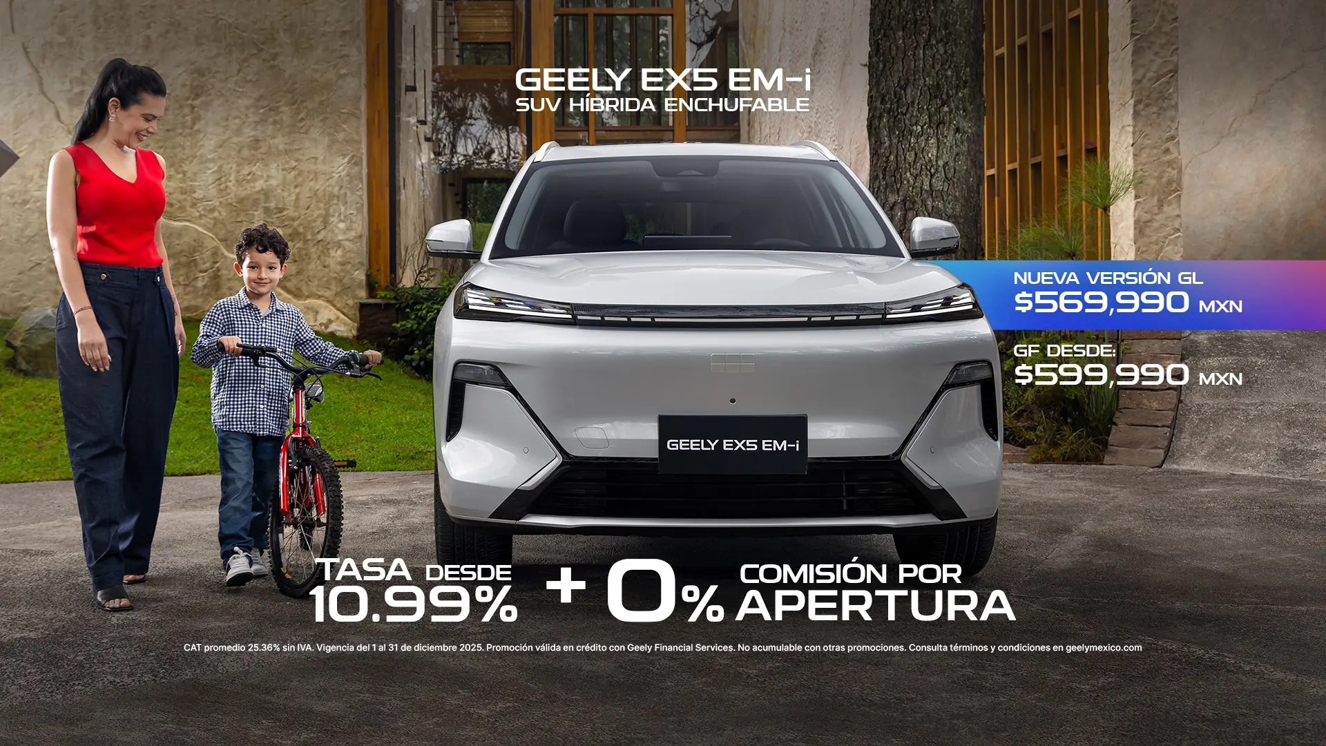 La tasa de interés aplica únicamente con el plan de crédito simple, a través de Geely Financial Services (BBVA México S.A., Institución de Banca Múltiple), para el modelo GEELY EX5 EM-i 2026 en su versión GF, a partir de un enganche de 50.00%, sobre un importe promedio a financiar de $299,995.00 MXN a un plazo promedio de hasta 72 meses y tasa de interés ordinaria fija anual sin IVA del 10.99%. Esta oferta no incluye el costo del seguro, mismo que podrá ser cubierto de contado o financiado, conforme a lo estipulado en su contrato, y no es acumulable con otras promociones. Monto de la mensualidad publicada incluye IVA e impuestos. Aplica 2.5% de comisión por apertura En plan BASE o 0% Comisión por apertura utilizando el plan BUEN FIN. No aplica seguro por un año gratis, y no es acumulable con otras promociones.