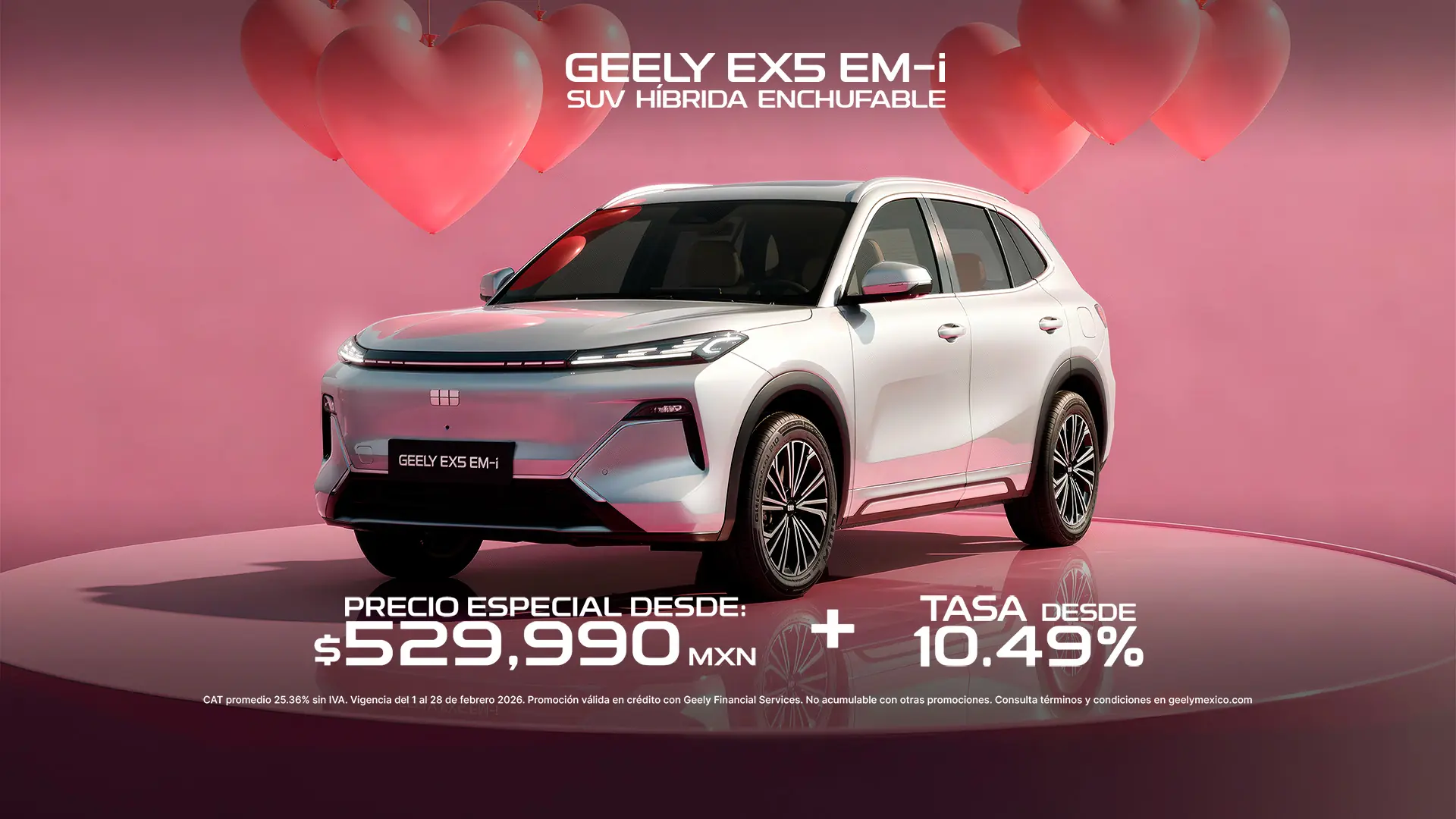 La tasa de interés aplica únicamente con el plan de crédito simple, a través de Geely Financial Services (BBVA México S.A., Institución de Banca Múltiple), para el modelo GEELY EX5 EM-i 2026 en su versión GL, a partir de un enganche de 50.00%, sobre un importe promedio a financiar de $264,995.00 MXN a un plazo promedio de hasta 72 meses y tasa de interés ordinaria fija anual sin IVA del 10.49% en plan LAN. Aplica 2.5% de comisión por apertura en plan BASE o 0% Comisión por apertura utilizando el plan LAN. No aplica seguro por un año gratis, y no es acumulable con otras promociones.
