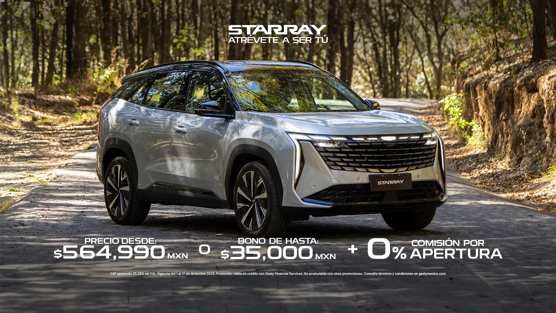 (3) El precio especial de $564,990 MXN aplica al utilizar el bono de $35,000 a precio. Aplica únicamente a través de Geely Financial Services (BBVA México S.A., Institución de Banca Múltiple), para el modelo Starray 2025 en su versión GL 2.0T, sobre un precio de $599,990 MXN bono aplicado a precio es de $35,000 MXN (IVA Incluido no aplica seguro por un año gratis, y no es acumulable con otras promociones. Aplica 2.5% de comisión por apertura en plan BASE o 0% Comision por apertura utilizando el plan BUEN FIN